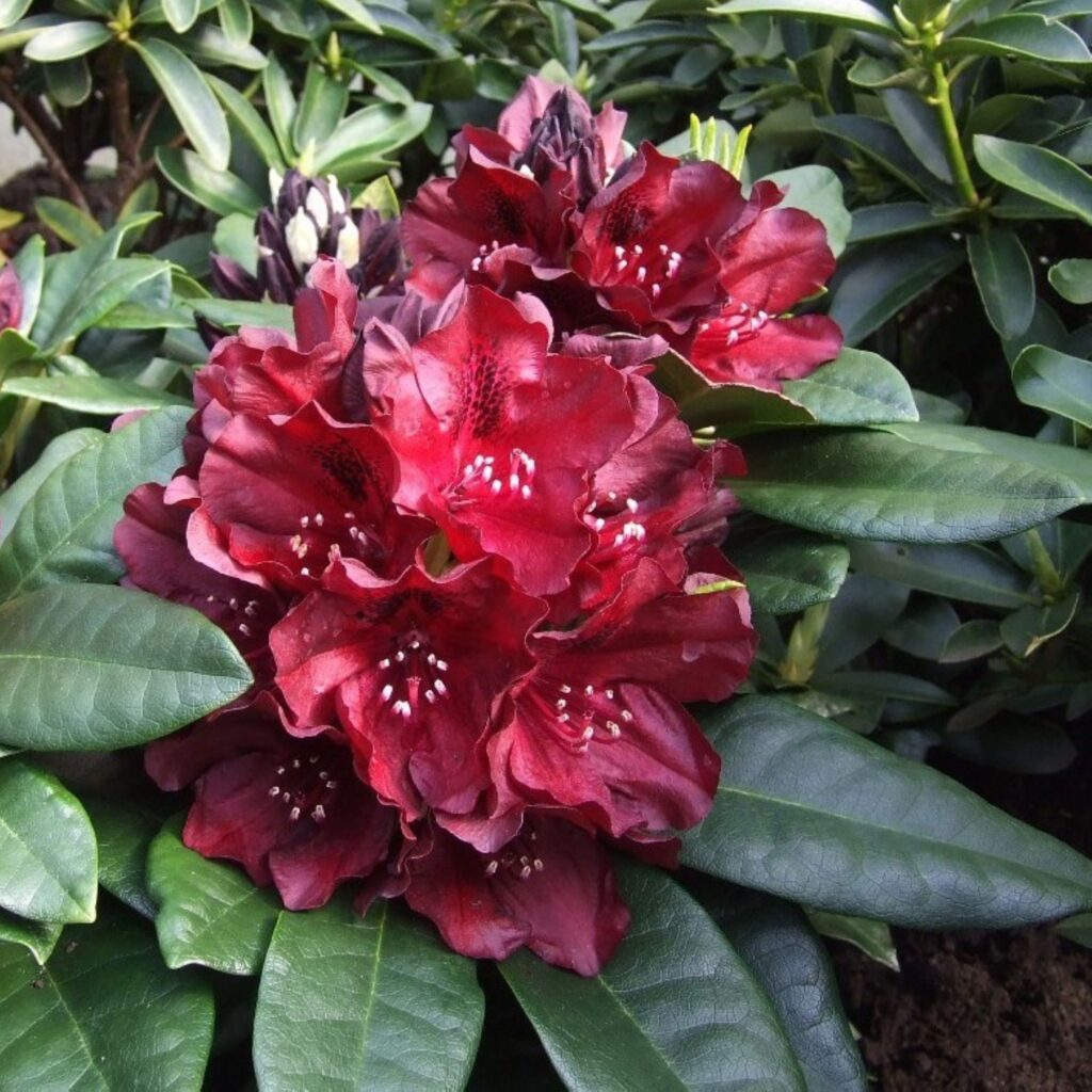 Deze indrukwekkende soort heeft diep donkerrode, bijna zwarte bloemen die een prachtig contrast vormen met het groene blad. Rhododendron Black Widow is een ware blikvanger en ideaal voor wie op zoek is naar een Rhododendron met een unieke uitstraling. De compacte groei maakt hem geschikt voor middelgrote tot grote tuinen.